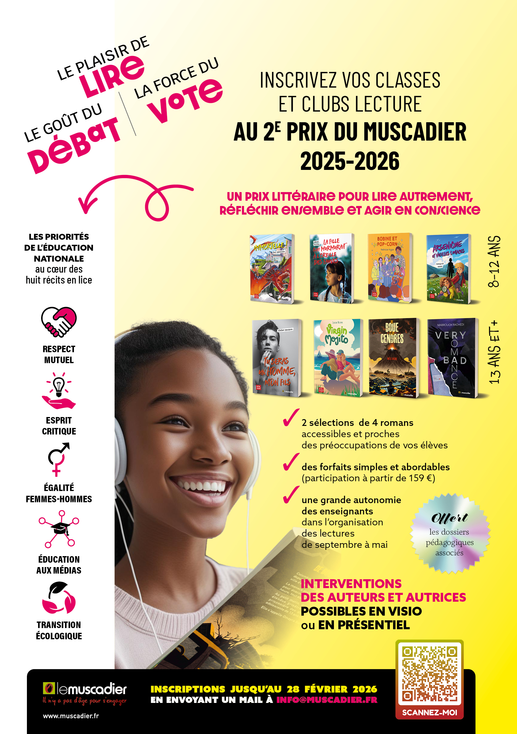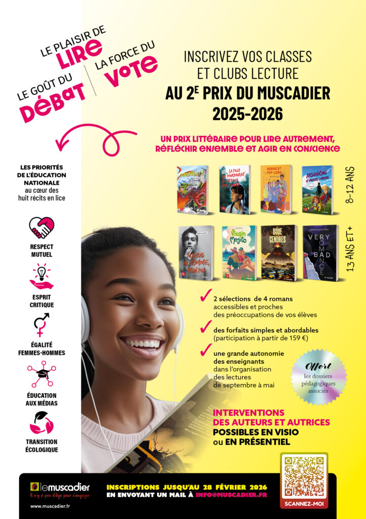 Tels sont les trois volets du 2e prix du Muscadier. Un beau programme, me direz-vous ? Certes, mais, avant tout, des livres qui plairont à vos élèves ! Forts de l’expérience réussie du 1er prix du Muscadier, organisé avec une quarantaine de classes sur l’année 2024-2025, nous lançons la 2e édition de notre prix, pour encore plus de surprises et de lectures addictives !